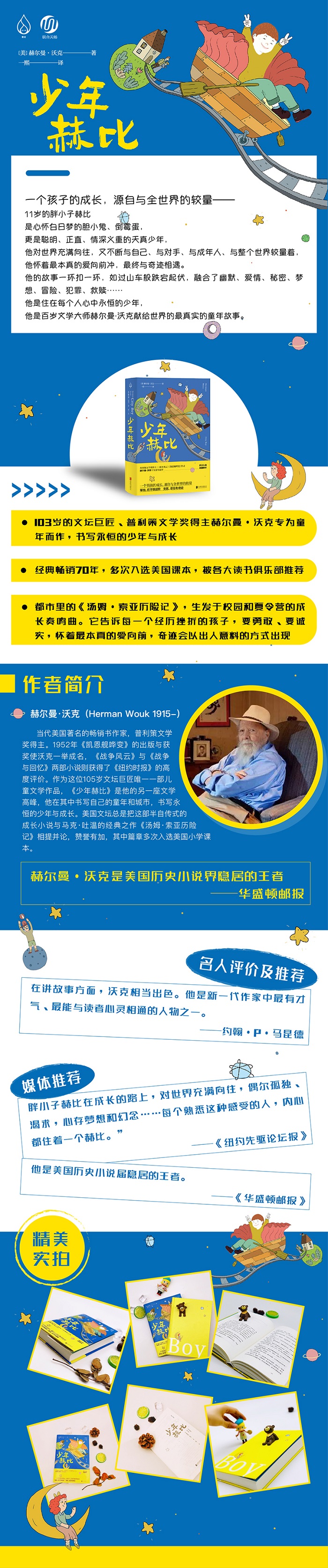 " 《少年赫比》是一部大师书写的儿童成长小说。住在纽约布朗克斯区的十一岁胖小子赫比,在学校、街头和乡村夏令营经历了种种冒险和遭遇。 他聪明但不擅运动,他是老师的宠儿却笑料百出。他和“对手”伦尼——一位学习垫底、帅气高大的运动健将之间,充满着男孩子间的较量与博弈。他暗恋露西,这个红头发的、铁石心肠的女孩,是所有折磨十一岁小男生的女孩们的化身。凭借着聪明才智,赫比的发明让他在夏令营上大放异彩,赢得了露西的青睐。但赫比的大胆行为也让他卷入了父亲公司的危机。赫比以孩子的勇敢和机智不但化解了自己和父亲的危机,也将成年人世界的虚伪击碎。"