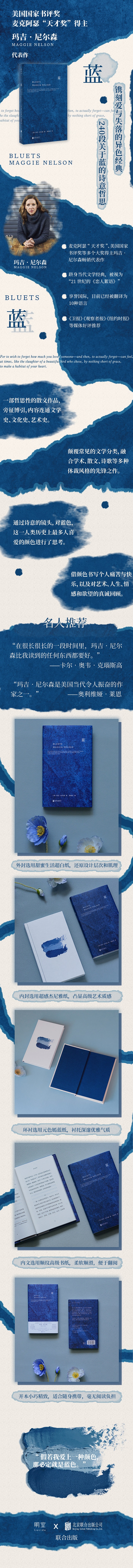 《蓝》是一部哲思性的散文作品,由240段关于蓝色的随笔组成。玛吉·尼尔森通过诗一样的语言,以及对文学史、文化史、艺术史的旁征博引,对蓝色,这一人类历史上多人喜爱的颜色进行了思考。她不仅仅将蓝色与文学、艺术相连,更将其与自身的个人磨难、爱与渴求进行勾连,完成了一部奇妙又无法定义的蓝色之书。 本书是玛吉·尼尔森畅销和被广泛阅读的作品。凭借这部作品,她跻身当代杰出的抒情散文家的行列。