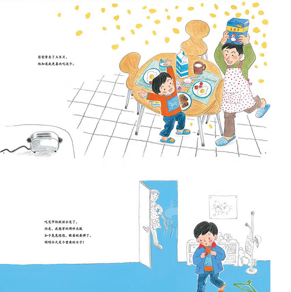 明明今天是个重要的日子,可是早上起床时头发睡乱了,做早饭时面包烤焦了,换衣服时衣服扣子要掉了,出门时还没赶上巴士……不过幸亏有爸爸在,问题都解决了。那么,今天到底是个什么日子呢?这个悬念一直贯穿全文,直到最后才揭晓,原来今天是弟弟出生的日子。这既是迎来家庭新成员的一天,也是父子俩亲密相处、家人间彼此关爱的一天。