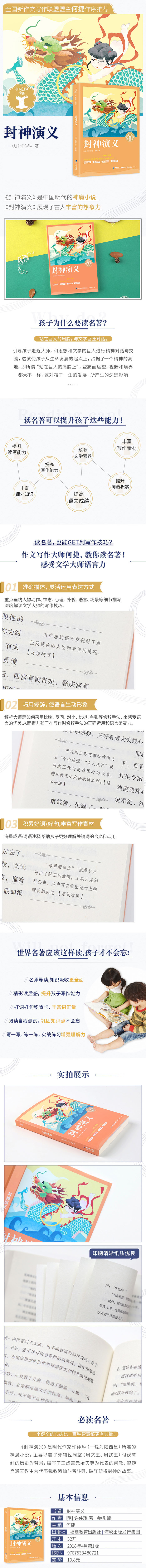 本书是我国古代的一部长篇神魔小说,故事以商朝作为时间背景,以纣王暴政统治作为历史背景,生动地描述了姜子牙顺应天意助周灭纣的过程。作品语言生动奇绝,人物和情节虽多,却被作者以巧妙的遣词造句疏理得脉络明晰。瑰丽的想象和磅礴的情节引人入胜,充满了神话韵味,为读者呈现了一个令人荡气回肠的魔幻世界。
