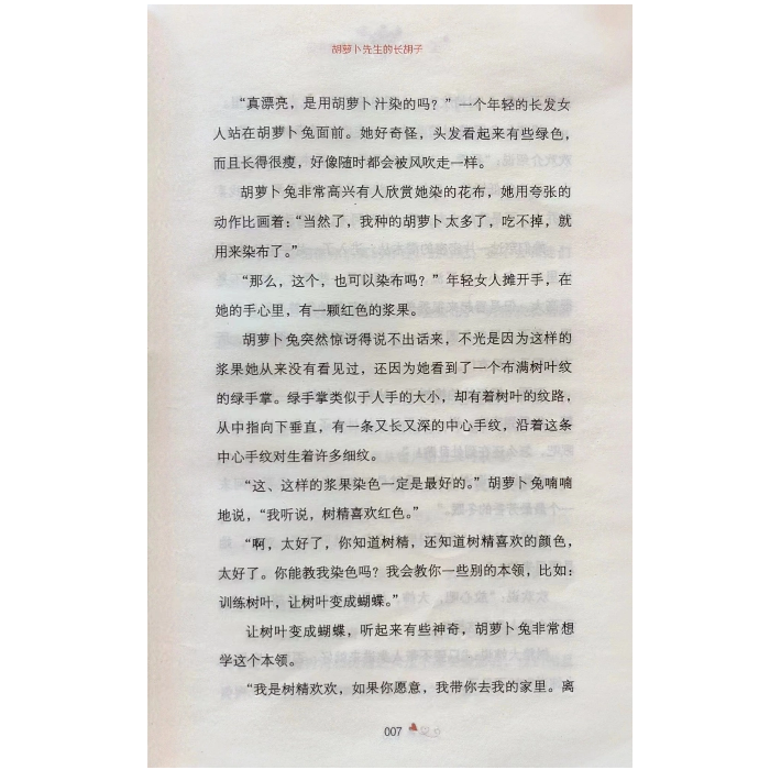 《胡萝卜先生的胡子》是作家王一梅创作的儿童文学获奖作品系列中的一本,包括《胡萝卜先生的胡子》《小树精和流浪汉》《米粒和蓝色眼泪》。文稿语言浅近,笔触细腻,表述生动,想象力丰富。如《小树精和流浪汉》是一篇以环保为主题的小说,由于人们乱砍滥伐树木,树精欢欢变成了隐形的树精后去世了,好多被砍掉树干的树精们也纷纷离开树林,八年后欢欢的孩子小羽出生,却也不幸变成了隐形的树精。后来小羽在流浪汉爸爸和大家的帮助下,穿上红白相间的毛衣,恢复成了一个真正的树精,和亲人朋友们一起回到了森林。故事结尾写一个男人来到树林,与树精们愉快的生活在一起,代表的是人与自然和谐共处,呼吁人类要爱护森林,在孩子们心中种下大爱的种子。《胡萝卜先生的胡子》语言诙谐幽默,令人捧腹之余,明白原来像胡子那样细微的事物,也可以有很大的价值。《米粒和蓝色眼泪》是一个有点忧伤的故事,忧伤中的一抹温情是米粒和小眼镜对小水怪无私的关心,告诉孩子们要做一个善良而美好的人。