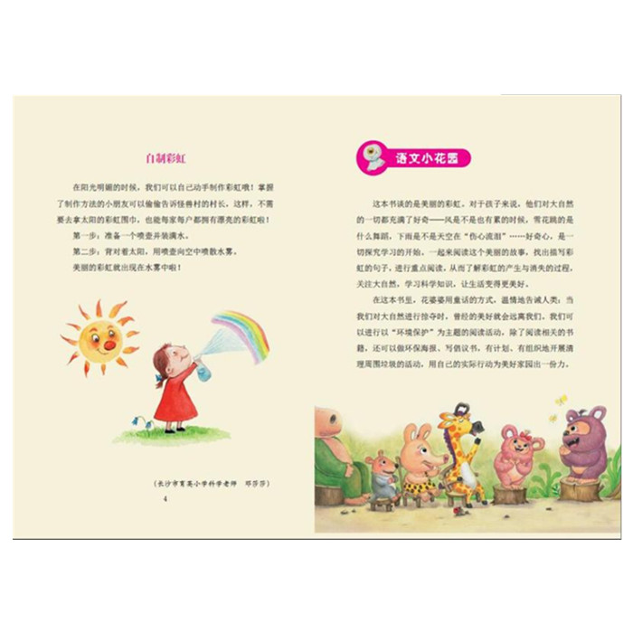 这套方素珍科普.语文精品馆丛书一共4本。每本绘本讲述一个童话故事,另附赠一本科普.语文指导手册夹于绘本之内。《怪兽村的彩虹》里彩虹是太阳先生的围巾,怪兽们非常喜欢这条美丽的围巾,他们做了一个*糟糕的决定……太阳先生却气炸了!到底发生了什么事呢?