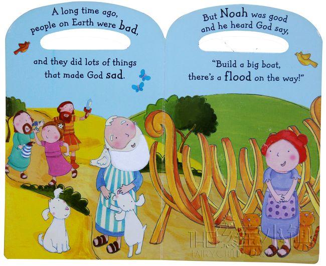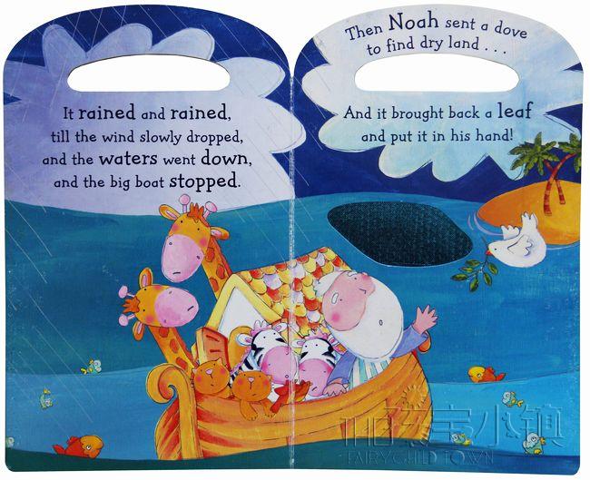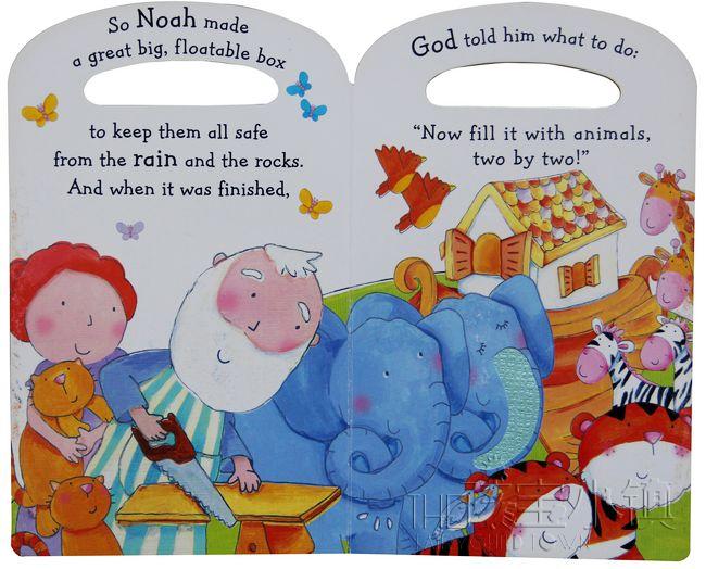 诺亚方舟几乎是孩子们最喜欢听的圣经故事,这款手提式带触摸更是增添了阅读乐趣。船板、诺亚爷爷的白胡子、大象的鼻子.....都是用特殊材料制成,阅读的时候摸一摸,很有趣吧!