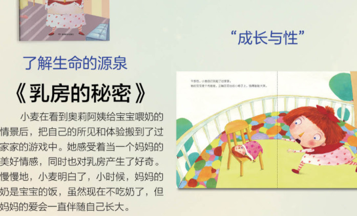 本系列绘本充分考虑到3~6岁儿童性发展的科学规律,在故事情节的设定、文本的撰写和图画的绘制过程中,认真把握好对这个年龄段孩子进行性教育的尺度问题,在满足儿童对自己身体的好奇心,帮助父母正视孩子的性心理发展规律,加强亲子交流方面进行有益的指导;它从孩子的生活体验出发,通过再现儿童熟悉的场景或故事,巧妙地融入了性教育的内容,而不是知识点的简单拼凑,可读性强,既吸引孩子“看”,又便于父母“讲”,使亲子阅读在温馨有爱的氛围里展开。《乳房的秘密》有助于孩子明白乳房是女性的身体标记,有助于妈妈与孩子建立健康的依恋关系。