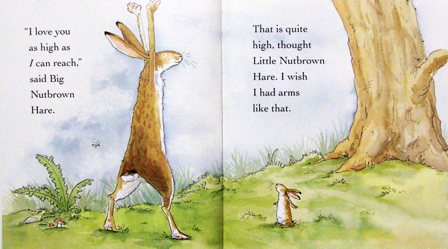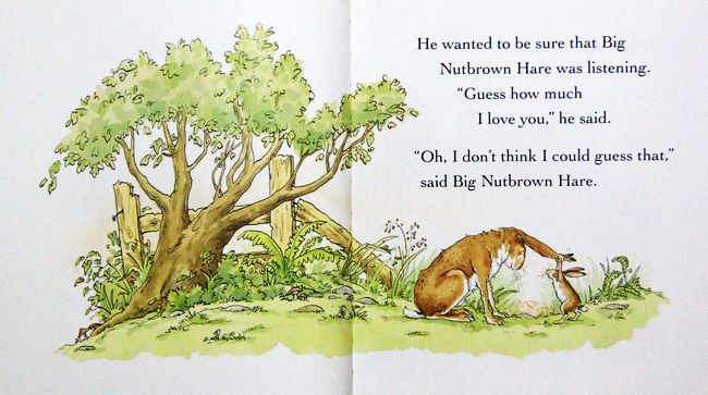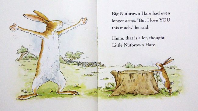 这本图画书里有一只像孩子的小兔子和一只像爸爸的大兔子。小兔子像所有的孩子一样爱比较。它们俩在比赛谁的爱更多一些。大兔子用智慧赢得了比赛和小兔子稍微少一点的爱,可小兔子用它的天真和想象赢得了大兔子多出一倍的爱。两只兔子都获胜了。整个作品充溢着爱的气氛和快乐的童趣,小兔子亲切可爱的形象、两只兔子相互较劲的故事构架以及形象、新奇的细节设置都对孩子有着极大的吸引力。