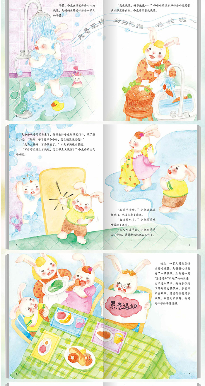 这是一本儿童图画故事书。水是生命之源,世界离不开水。坚持节约用水,合理利用水资源,要从娃娃抓起。故事里的兔弟弟从老师那里学习了日常节约用水的好办法,兔姐姐和爸爸妈妈都很为他感到骄傲,并且都要向他学习呢。