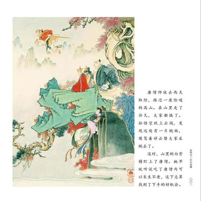 连环画《孙悟空三打白骨精》选自《西游记》之二十七回“尸魔三戏唐三藏”。这部作品由擅长画猴的赵宏本先生和以仕女画闻名的钱笑呆先生组合成黄金搭档创作的一部里程碑式的优秀连环画作品。二人经过合理分工,充分发挥了自己的专长和想象力、创造力,运用了广大连友都喜爱的白描绘画技法,无论是在人物塑造,位置结构,疏密间隔,人物宾主关系上,都发挥得恰到好处。画面动静相宜,线条刚劲而婉丽,笔法动之以韵,旋之以律,虽刻意追求,又不显矫揉造作。衣纹组织和山石皴法都具有浓郁的古朴风味。服装、风带、飘荡的云彩,助于烘托出飞的动态,画面画得很美,更深刻地表现了主题,使作品具有强烈的感染力。