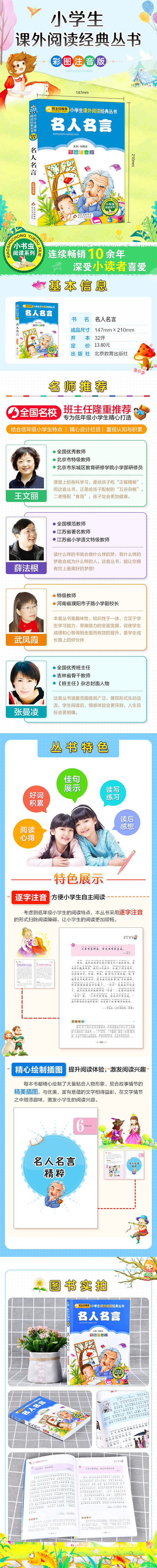 国名校班主任隆重推荐,专为孩子量身订做的阅读书目。畅销10年,经久不衰,适合低年级儿童阅读的彩图注音版课外书,中国小学生喜爱的畅销10年,经久不衰,发行量超过7000万册,中国小学生喜爱的图书之一。 《小书虫阅读系列·小学生语文*丛书:名人名言(彩图注音版)》紧扣语文新课程标准,针对小学低年级学生的特点,队认;以认识与积累为重点,精心设计栏目,让学生在阅读中提升阅读能力和写作能力。