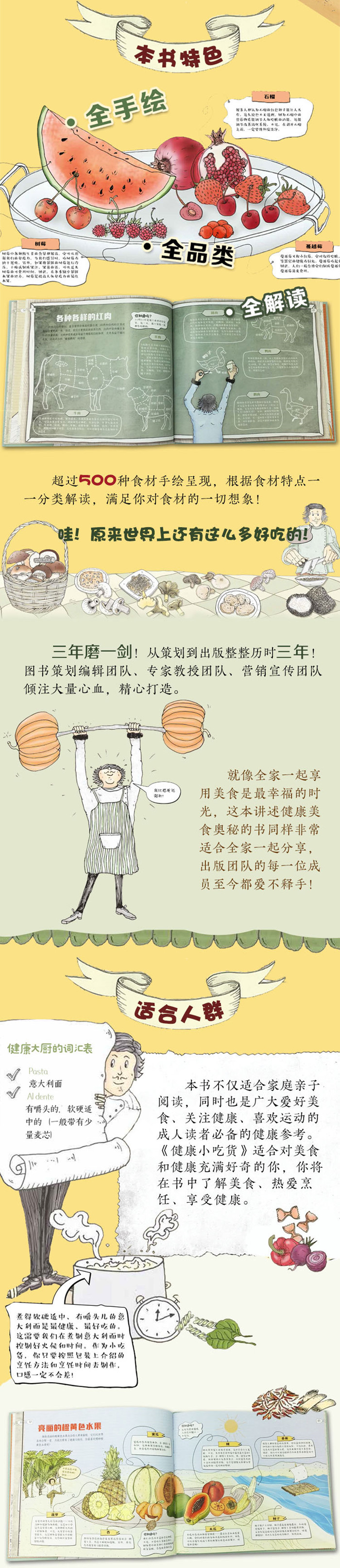 这本书设定的人物“健康大厨”,可以陪读者学习健康饮食知识。为了帮读者发现、了解有关面包、肉类、海鲜、奶制品、蔬菜、水果香料等有关的知识,“健康大厨”带着读者游遍世界,寻找各种健康食品:鸡肉、生菜、洋葱……一系列充满惊喜的场景和“健康大厨”的幽默解说,让读者可以轻松了解均衡饮食的重要性,让他们知道应该多吃什么、少吃什么,才会长得更健康、更强壮。