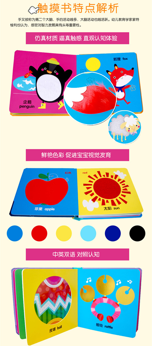 在国外,触摸书被认为是家庭教育的首选书本,因为西方人认为触觉是宝宝认识世界的主要方式,也是协助其他感官系统发挥功能的基础,多元的触觉探索有助于促进动作及认知发展。而这套《小不点的触摸书》独特的仿真材质,能够让幼儿触摸各种不同的材质,辨别物体是光滑还是粗糙,刺激宝宝的触觉感官发育,加速宝宝智力增长;同时各种鲜艳的色彩和可爱的画面也会刺激宝宝的视觉成长;频繁的触摸也会增强宝宝的动手能力。在我看来,这实在是一本非常好的幼儿感官认知启蒙书。