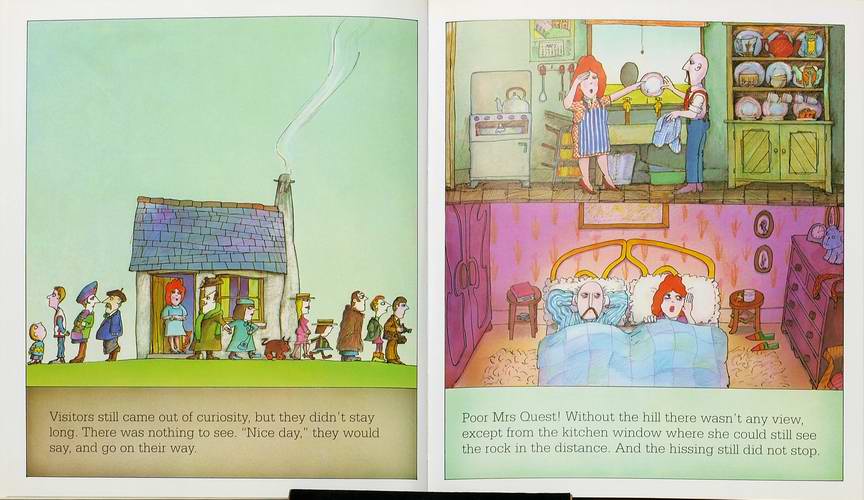 Mr. and Mrs. Quest lived in a little house on the very top of a hill. People from all around came to visit and the view would have been perfect but for the rock that blocked it. Fed up with no view, Mr. Quest decided to move the rock. He never expected what happened next This deceptively simple and humorous picture book is another understated masterpiece from a picture book master.