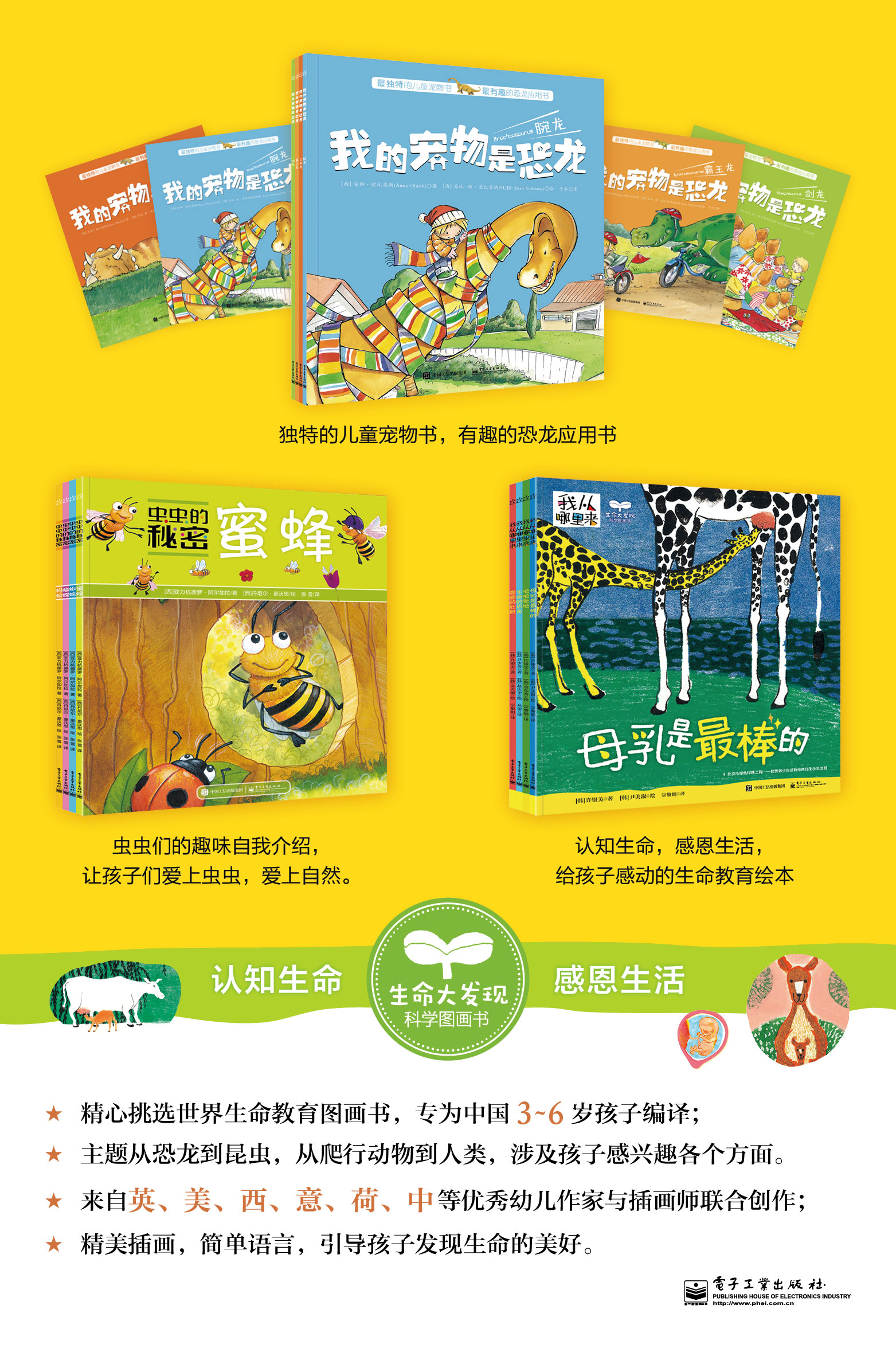 本系列图画书共4册,以独特的**人称的视角,向小朋友们介绍蚂蚁、蝴蝶、蜜蜂这三种昆虫和它们的近亲蜘蛛。全书图画色彩艳丽,角色惹人喜爱,语言风趣生动,详细讲解了这四种虫虫的生活习性、在生态系统中的重要作用,以及和人类的密切关系……让孩子们在轻松的氛围中了解这些自然科学知识,有助于培养他们热爱生命、热爱大自然的情趣。