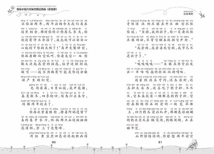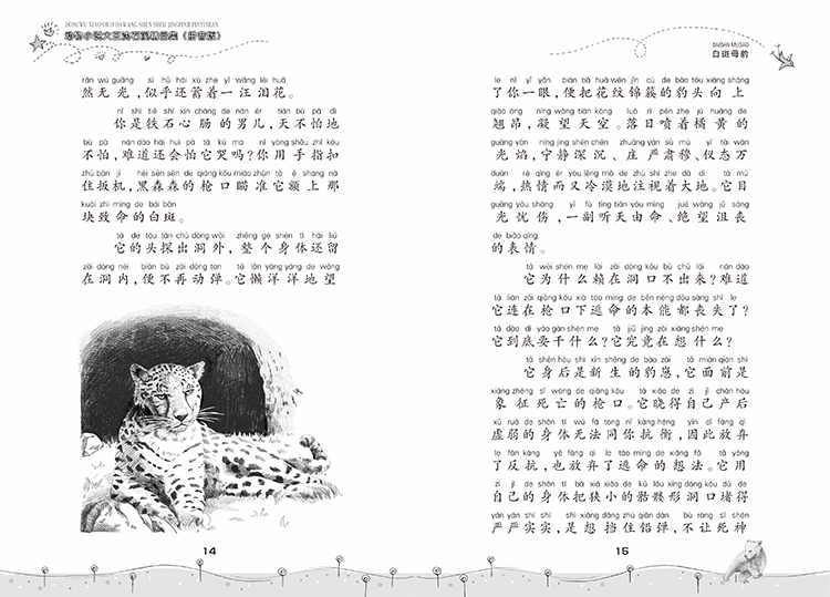 2、《白斑母豹》是“动物小说大王沈石溪精品集(拼音版)”系列其中的一本,收录了《白斑母豹》《大灰狼与小绵羊》《会做生意的狐狸》《棕熊的故事》等四篇文章。这些故事描述了人与动物之间、动物与动物之间的恩怨情仇,穿插了对动物生活习性的描述,对学龄前儿童和低年级儿童都有很深的教育意义。