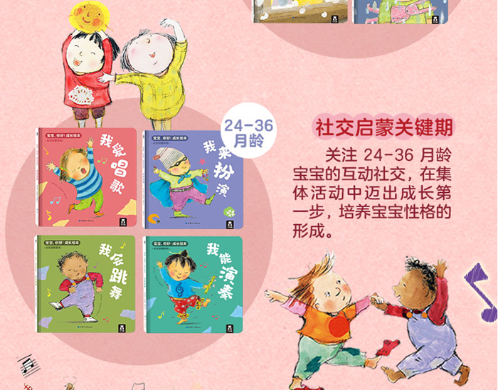 《宝宝,你好!成长绘本》抓住了宝宝成长的三个关键期——大运动发展、自然认知、社交启蒙,根据0-3岁幼儿身心发展规律和认知特点全新打造。在大运动发展系列,促进宝宝肢体动作发展;在自然认知系列,可以引导宝宝亲近自然;在社交启蒙系列,通过唱歌、跳舞、演奏、装扮,在集体活动中,引导宝宝勇敢迈出社交*步。