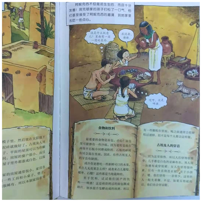 这套“神奇时光探险之旅”看漫画学历史的书,正是小朋友学习历史的敲门砖。在书中,宾克顿家的三个孩子误闯神奇时光旅行社,翻阅旅行社老板佩蒂格鲁的独家旅游指南,进行时光旅行,在惊险有趣的冒险中畅游了中世纪、古埃及、古希腊、古代中国、维京时代和冰河世纪。有趣的是,故事的铺陈很有技巧地将历史隐藏其中,对于觉得学习历史太沉重的孩子来说,完全不着历史痕迹。我建议,孩子们在看这一系列童书时,和书中一派轻松的故事情节叙述一样轻松阅读,跟着宾克顿家的孩子们去冒险,去看古埃及人的生活,尝尝汉朝时的面条,参加古代奥林匹克运动会,或是经历一场冰河世纪的探险。