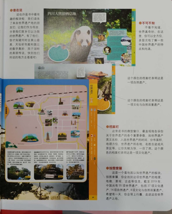内容包括长城、莫高窟、大运河、丝绸之路、可可西里等52项中国的世界遗产,以主题页的形式展现世界遗产的地理知识和人文知识,将地图、地理知识与世界遗产知识相融合,引导小读者徜徉历史、认知世界遗产的重要性。全书共52个主题页,25幅专题地图,近500幅图片,12段二维码视频。