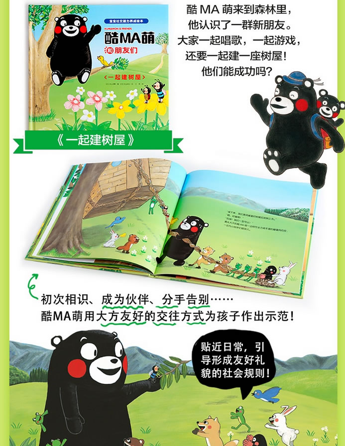 《酷MA萌和朋友们:宝宝社交能力养成绘本》系列(3册)由日本熊本县官方授权,是专为1-5岁低幼宝宝设计的社交能力养成绘本,用日本特有的可爱暖萌风格,讲述熊本熊与朋友们的快乐生活:一起游戏、一起野餐、一起休息,与伙伴互相帮助,齐心协力完成任务。