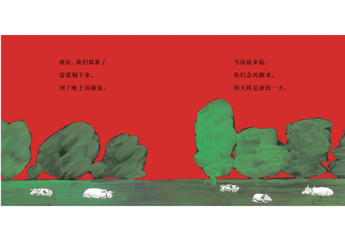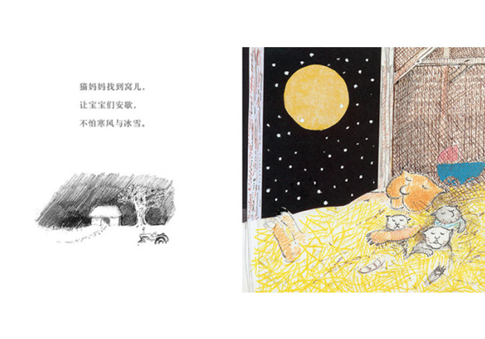 这是一首轻快的摇篮曲,一天结束时,每个人都很疲惫,猫妈妈和她的小猫、一家子熊、一条鱼、一头鹅、一只青蛙,甚至是月亮上的人……每个人都很疲倦,每个人都在低声说着“嘘——乖乖睡”。在书的后半部分,大家依偎在一起,躺在舒适的地方熟睡,这提醒读者,睡觉时间到了,请把头靠在枕头上:明天又是新的一天。 现在,可以去睡觉了。嘘——乖乖睡。