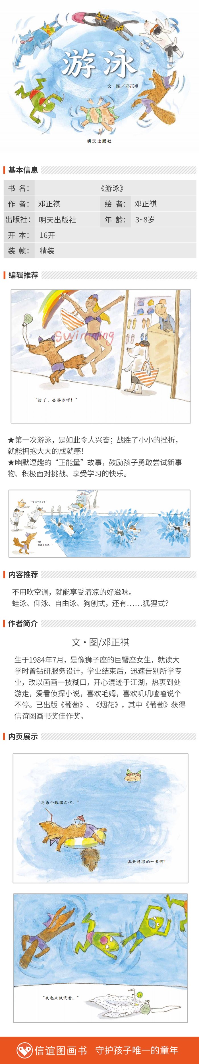 狐狸穿着新泳裤,蹦蹦跳跳、开心地来到游泳池,什么都不会的他,一看到游泳池,就迫不及待的想往泳池里冲……狗却一把抓住他,还说:“要先做暖身操喔!”只见狐狸一下子东摇西晃的失去平衡,弯腰的时候,又一下子整个倒栽到地上,手忙脚乱的样子,十分逗趣。 好不容易做完操,狐狸看着狗轻松的跳入水中,开始游了起来,他心里想:“啊!就这么简单。”也立刻扑通的一声跳下水,没想到,啪啦啪啦的两声后…… 咕噜……咕噜……咕噜……狐狸沉到了水里了。 这下该怎么办?他还会在游泳池里发生什么事呢? 故事里的狐狸,不只一次沉到水底,但他并没有因此就对水产生恐惧,反而在岸边观察不同动物的游泳姿势,并开始模仿他们的动作,像跟着河马教练拿浮板练习打水、学青蛙游蛙式、向狸猫学习换气、和猪一起学仰泳,最后还发明了“狐狸式”游法,让猪小妹都羡慕起他来。 很多孩子就像狐狸一样,一到游泳池边,就兴奋的想往水里冲,享受玩水的乐趣与清凉,但也有些孩子可能因为曾有溺水的经验或是较怕水,就不太敢尝试。这时,可以让孩子跟着故事,先来一场纸上游泳课!一边看着狐狸逗趣的姿态和丰富的肢体动作,一边和他一起学习。在自然的模仿下,先让孩子放轻松,对游泳有基本概念,到了泳池再请老师或教练教导、协助,相信很快就能享受游泳这个很好的运动。 孩子的“第一次”尝试,难免会遇到挫折,多鼓励他们,一定能克服学习的障碍!