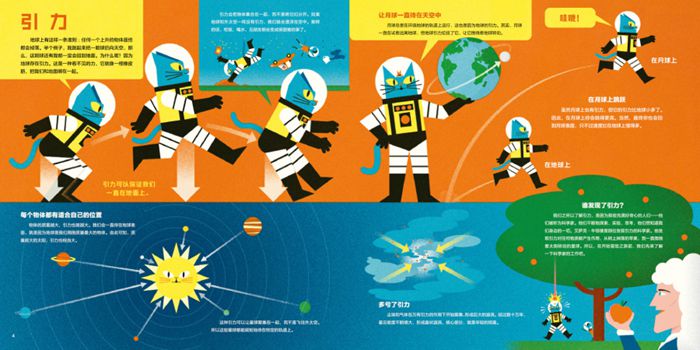 《太空猫:物理大爆炸》首先吸引我的是它的色彩,利用大面积的橙色、蓝色、粉红色和明黄色色块将画面分割成了几个部分。这样以来,复杂的知识点也被分解成若干块,条理变得清晰,理解起来也更容易。翻开书页,是孩子们喜爱的卡通人物——太空猫、太空鼠和太空熊等。他们是现实小孩*鲜明的写照——有时调皮捣蛋,但探索起科学来又十分认真。没有说教,利用明亮、活泼的色彩吸引孩子的注意力,跟着书中的小伙伴们来场物理世界的冒险之旅就能学到知识,是本书给我的*印象。