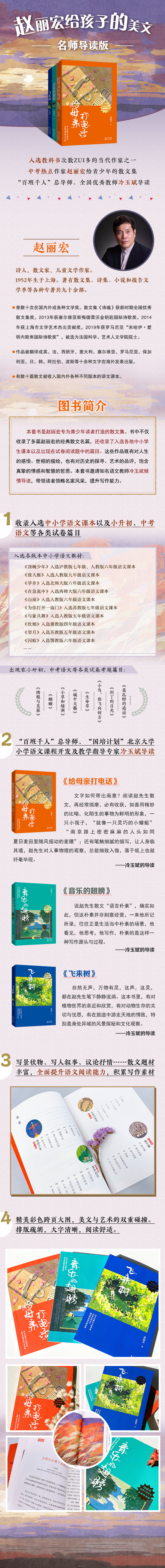 本套书是赵丽宏专为青少年读者打造的的散文集。书中不仅收录了多篇赵老师的经典散文名篇,还收录了入选各地中小学生课本以及出现在试卷阅读题中的篇目。这些作品既有对人生的感悟、世象的描绘,也有对历史的探寻、艺术的品评,饱含真挚的情感和智慧的哲思。本套书邀请知名语文教师冷玉斌倾情导读,带领读者领略名家风采,提升写作能力。