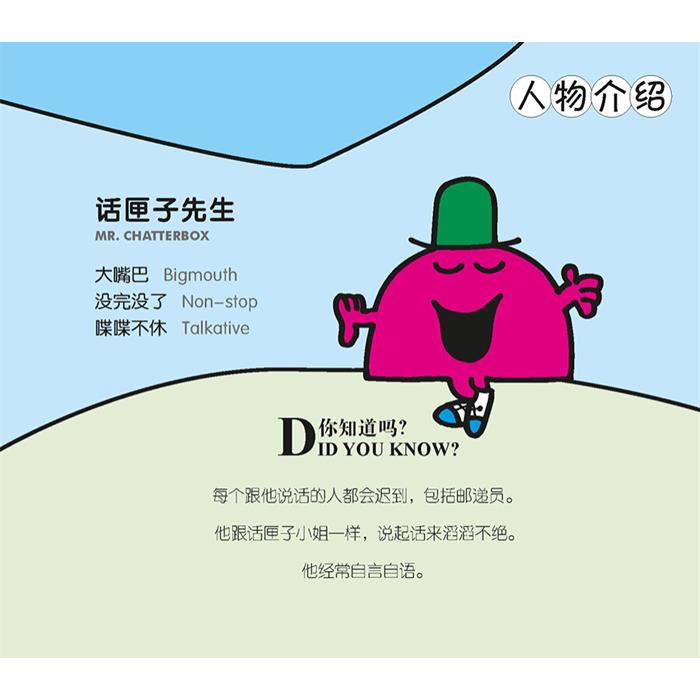 话匣子先生说起话来没完没了,不管别人想听还是不想听。安静先生喜欢安静,却和一只爱说话的鹦鹉成为邻居。害羞小姐想了一个办法,让话匣子先生和鹦鹉说话。这样话匣子先生终于可以不停地说话了。简洁、幽默的文字内容,让孩子们在欢笑声中学会表达自己的情绪,正确认识自己;故事情节充满乐趣,诠释着生活中待人接物的基本道理和原则。