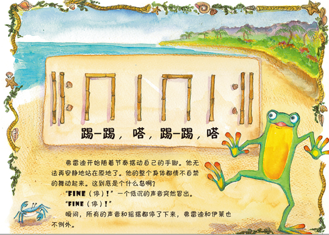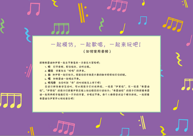 这是一套非常适合亲子共同听读的音乐启蒙绘本,引进自美国哈尔·伦纳德出版集团。书中不仅包含有趣的故事、好听的音乐,生动的插画,还渗透易懂的音乐常识,特别能吸引孩子们的注意力。全书共四册,由一位有三十年以上教学经验的音乐老师编写,帮助孩子们在聆听、阅读和认知的路上快乐成长。弗雷迪和伊莱的小木筏在一个小岛搁浅了。他们跟着神秘的“哇呜”声穿过丛林,却遇到了说着听不懂的语言的紫色大象!他们有危险吗?还能回到高音谱号岛的家中吗? 学习重点:节奏基础知识,常见节奏、速度和节拍。