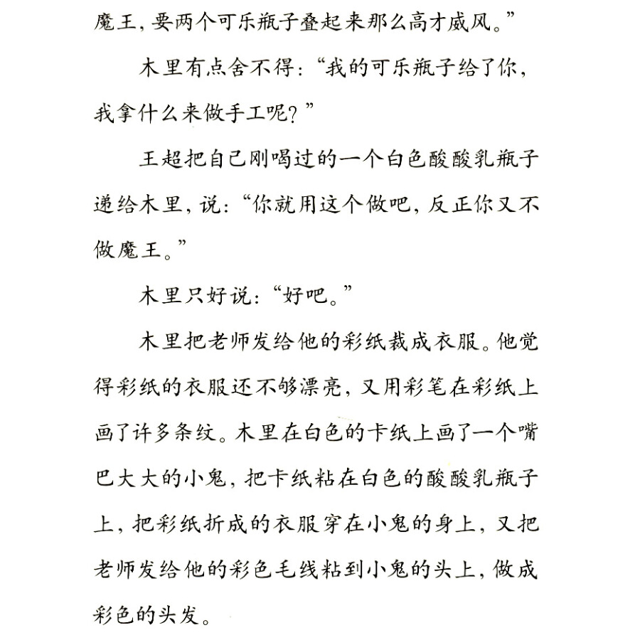 月亮岭幼儿园大班正在上手工课。老师说:“**,请小朋友们开动脑筋,用可乐瓶子、彩纸、毛线和布头,做一个手工作品,人也可以,妖精也可以。”同学们立即动手做了起来。大个子王超和小个子木里是同桌。王超左手拿着自己的可乐瓶子,右手伸过桌子,对木里说:“木里,把你的可乐瓶子给我吧,我要做_个魔王,要两个可乐瓶子叠起来那么高才威风。”木里有点合不得:“我的可乐瓶子给了你,我拿什么来做手工呢?”王超把自己刚喝过的一个白色酸酸乳瓶子递给木里,说:“你就用这个做吧,反正你又不做魔王。”木里只好说:“好吧。”木里把老师发给他的彩纸裁成衣服。他觉得彩纸的衣服还不够漂亮,又用彩笔在彩纸上画了许多条纹。木里在白色的卡纸上画了一个嘴巴大大的小鬼,把卡纸粘在白色的酸酸乳瓶子上,把彩纸折成的衣服穿在小鬼的身上,又把老师发给他的彩色毛线粘到小鬼的头上,做成彩色的头发。马玲玲的手巧,很快就给高大的可乐瓶子戴上了一顶金黄色的帽子,披上了金色的斗篷。“我是一个国王,你们全都得听我的!”那个可乐瓶子做的国王得意地说。孩子们咯咯咯笑起来,因为是马玲玲在国王的后面,装出国王的声音吓唬大家,大家当然不怕。“我是一个魔王,要把你们全吃掉!”呀,王超做的魔王真可怕,两个可乐瓶子串在一起,高高大大,钢针一样的头发朝天竖起来,牙齿尖尖,舌头老长。教室里热闹极了。高大的魔王和可怕的妖精们在比武功,看究竟谁厉害。美丽的公主和英俊的王子坐在一起,你看着我,我看着你。老师对这一堂课非常满意。她敲敲桌子说:“小朋友们,把作业都交上来好吗?”孩子们高高举着自己的作品,拥到老师跟前,又呼啦啦一下子回到了座位上。只有木里还站在老师的跟前,把手背在身后。老师微笑着问:“木里,你的作业呢?”木里很喜欢自己做的这个大嘴巴小鬼,有点舍不得交给老师。木里犹豫了一会儿,说:“老师,我还没有做完。”“给我看看,好吗?”老师说。木里把自己做的小鬼递给老师。老师看了,问木里:“你怎么没有用可乐瓶做呀?”“我没有瓶子了。王超说他要用两个可乐瓶子才做得出魔王来,我就把我的瓶子给他了。”木里说。“这是什么?是一个大笨蛋吧?”大个子王超爬到桌子上,把脖子伸得长长的,大叫起来。“哈哈,木里做了一个大笨蛋!”教室里响起了哄笑声。“它不是一个大笨蛋,它的名字叫大嘴巴小鬼。你们看,它的嘴巴这么大!”老师说:“木里,你做得很好!”“我的作业要交给老师吗?”木里问。“不用交了,你自己留着吧。”老师说。木里把他的手工作品高高举着,欢呼起来:“好啊!我的大嘴巴小鬼可以自己留着喽!”P7-14