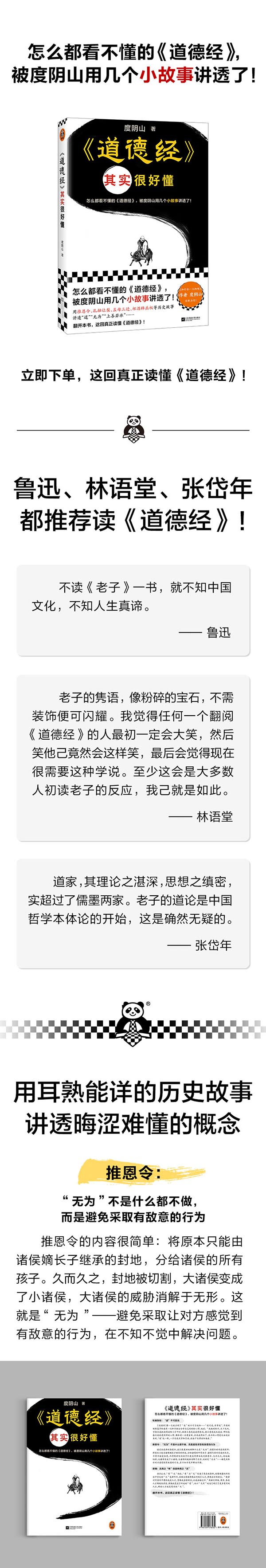 ◆ 怎么都看不懂的《道德经》,被度阴山用几个小故事讲透了! ◆ 梁启超、林语堂、曾国藩、鲁迅都读《道德经》! ◆《知行合一王阳明》作者度阴山全新力作! ◆ 用耳熟能详的历史故事讲透晦涩难懂的概念! ◆ 用推恩令、孔融让梨、孟母三迁、杯酒释兵权等历史故事讲透“道”“无为”“上善若水” ◆“道”不可言说 ◆“无为”不是什么都不做,而是避免采取有敌意的行为 ◆ 无用之“有”创造有用之“无”
