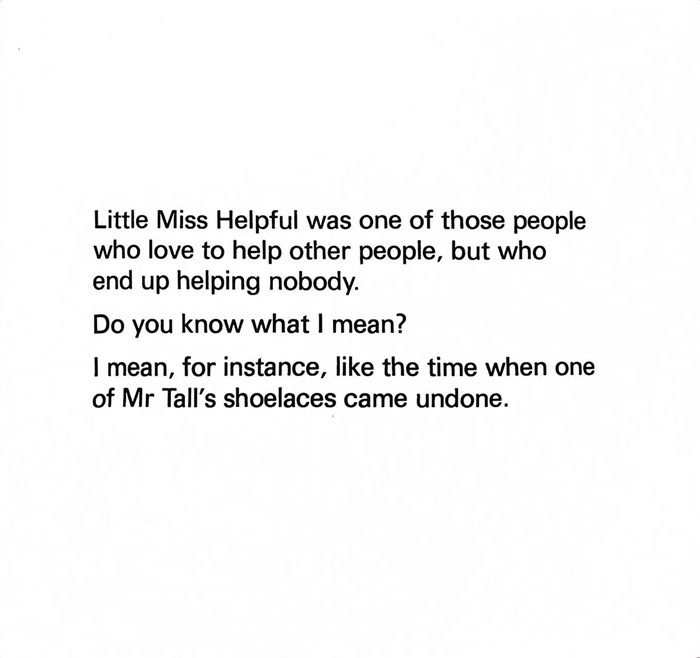 Little Miss Helpful was one of those people who love to help other people, but who end up helping nobody. Do you know whatI mean?