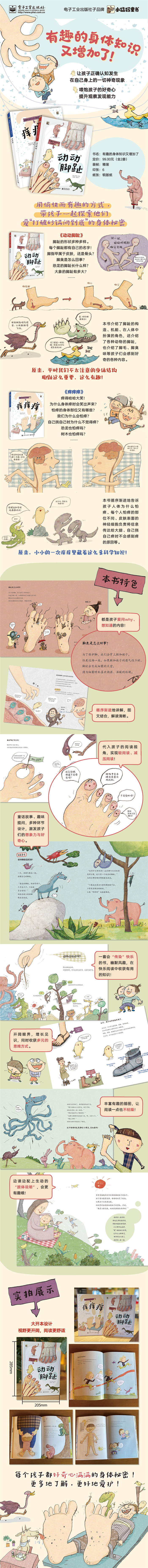 这套书讲解了每个孩子都感到好奇的身体秘密!恐龙的脚趾长什么样?大象的脚趾有多大?脚趾甲是属于皮肤,还是属于骨头呢?为什么有的痒会笑出声,有的痒却令人难受无比?动物跟植物也会有痒的感觉吗?有的话会做出什么反应呢?这套有趣且易于学习的身体科普书,带小朋友认识人体结构,探索身体的秘密。《动动脚趾》用愉快有趣的方式让小朋友认识常被我们不太注意的身体结构——脚指头。书中介绍了脚的构造、机能、在身体中扮演的角色,还介绍了各种动物的脚,也介绍了脚毛、脚臭味等孩子们会感到好奇的各种内容。《痒痒痒》介绍了人体以及痒的相关知识。为什么身体痒时会笑出声来、身体部位中哪一个部位容易感到痒、动物跟植物是否也有痒的感受、自己搔自己痒时为什么不觉得痒等,本书一一地为孩子们解开对“痒” 的各种疑惑。