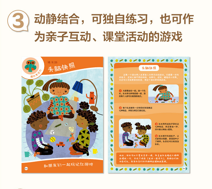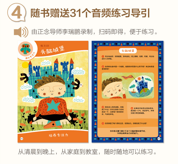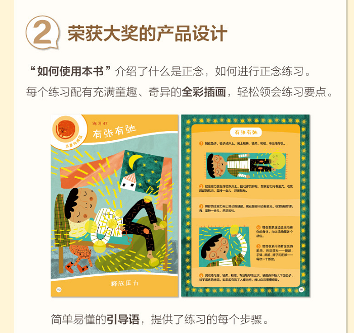 本书包含50个富有创意的正念练习。这50个练习的时间从早晨覆盖到晚上,涉及儿童生活的各个方面。每个练习配有充满童趣的全彩插画,提供了易于理解与遵循的步骤,供不同能力水平的儿童使用。这50个正念练习分为5个类别,分别是开启你的一天,找寻平静,聚焦,敞开心扉,休息与放松。可以培养孩子的各种能力,帮助儿童提升专注力,学会控制情绪,发展同理心,释放压力,放松身心,并让孩子在练习中获得快乐、平静、专注与内在的力量。