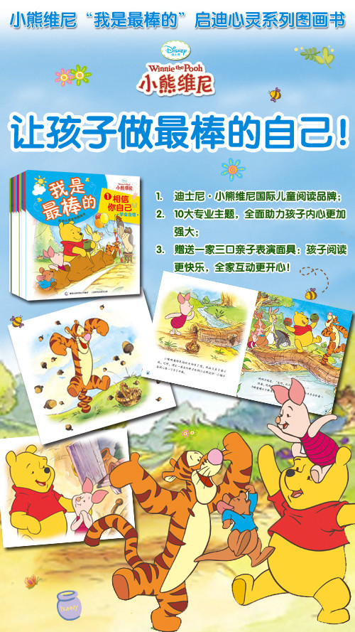 用爱滋润孩子的心田,让孩子的内心更加强大!《小熊维尼“我是最棒的”启迪心灵系列图画书》是专门为2~6岁儿童打造的心灵成长图画书。全套图书精心挑选维尼10个经典故事,让孩子在美妙温馨的故事里,学会自信、学会分享、学会给予、学会坚持、学会自控、学会宽容、学会承诺、学会诚实、学会合作。