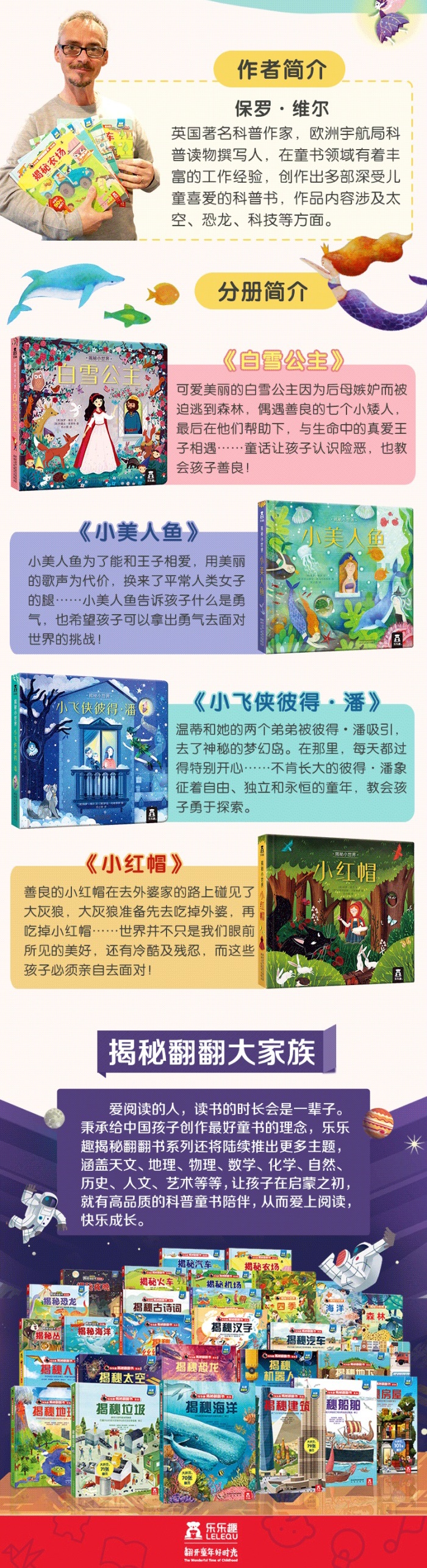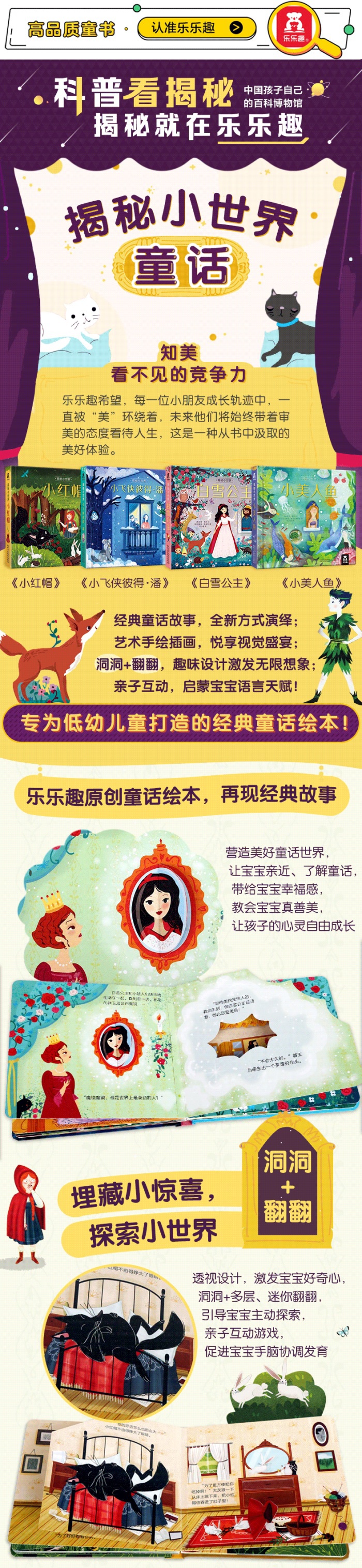 乐乐趣“揭秘小世界”系列是专为低幼儿童创作的“童眼看世界”认知绘本,旨在让孩子通过各种各样的创意“洞洞”和“翻翻”,阅读经典、认识世界。此系列包含《小飞侠彼得·潘》《白雪公主》《小美人鱼》《小红帽》。经典童话故事、丰富内容和童趣插画,搭配孩子喜闻乐见的立体互动形式,充分激发和满足孩子的好奇心,锻炼孩子的手部精细动作,让孩子在戳洞洞、抠翻翻的游戏中阅读经典!
