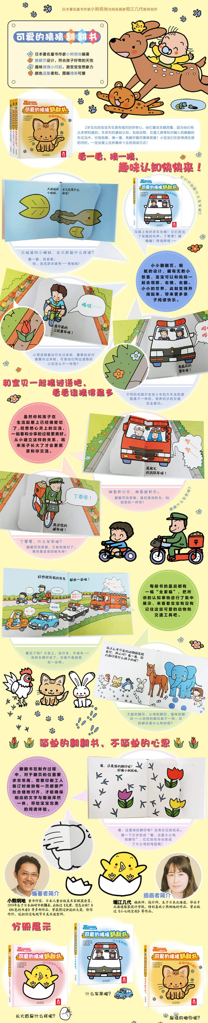 这是一套专为低幼宝宝设计的翻翻认知书,包括3册。书中每页都是简洁可爱的画面,根据认知内容精心设计各种异形翻页,锻炼手部精细动作,提高观察力和想象力,轻松认知各种常见事物。语言可爱生动,易学好模仿,发展宝宝语言能力。色彩鲜艳有助于宝宝的视觉发展;简洁的画面有助于宝宝提取事物的特征;文字有韵律地重复,拟声词的运用增强参与感,在与父母的互动中完成阅读参与、互动。
