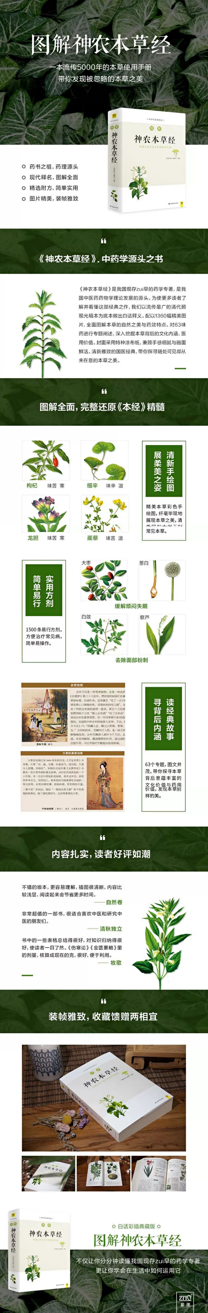 《神农本草经》成书于东汉,是我国现存最早的药学专著,全书分三(或四)卷,收载药物365种,分上、中、下三品,以对应天、地、人三界,反映了我国古代天人合一的思想。为了更全面、完美地呈现这部医学经典,《图解神农本草经》对原著进行了一系列的编辑创新:首先,以清代顾观光的《神农本草经》辑本为底本,结合目前流传的多种版本准确译出白话文。对每味药用古本线描图、现代摄影图、精美彩绘图、人体牵线图共四类图示进行阐释,力求既保存其古典特色,又最大程度地挖掘其实用价值,可作为医学工作者案头必备的工具书之一,又可作为现代人生活养生的居家典籍。