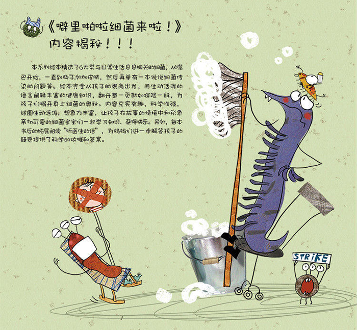 这套《噼里啪啦系列》绘本精选了6大类与日常生活息息相关的细菌,从嘴巴开始,一直到肠子.外加皮肤,然后再单有一本说说细菌传染的问题等。