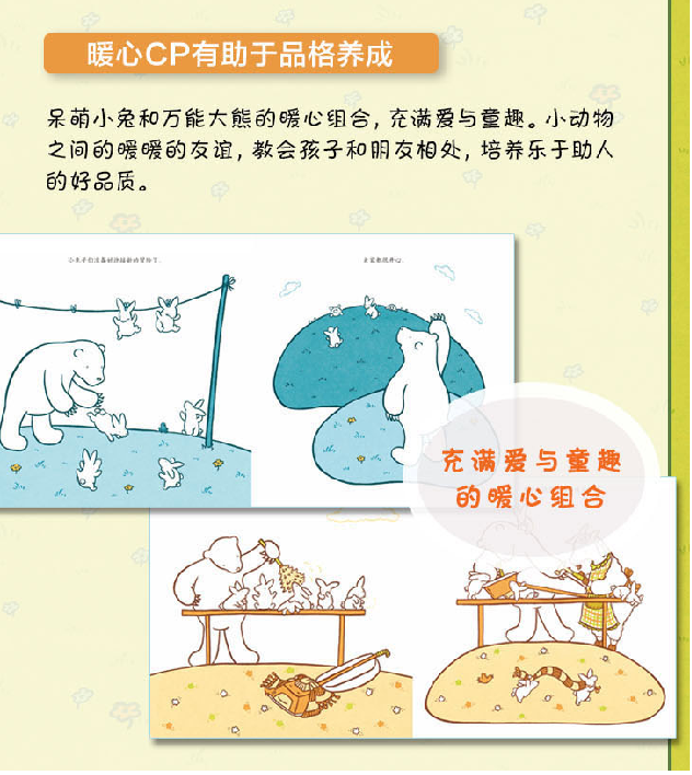 六只嬉戏的小兔子,常常因为山羊先生,陷入各种各样的麻烦之中 — 被拖拉机溅得满身泥水;被吸进吸尘器沾满了灰尘;被剪刀不小心剪断了尾巴。但他们都会向大熊求助,麻烦一个都解决了,大家都很开心。作品用贴近生活的主题和最简洁的语言,清新唯美的画面呈现给读者,让读者从中感悟到亲情的温暖、友情的可贵和梦想和美好。