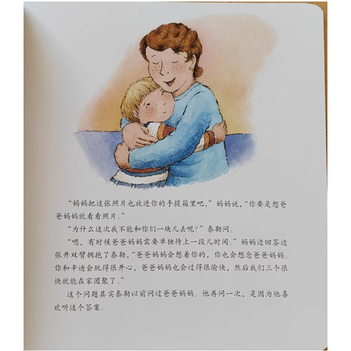 在父母出门期间,泰勒得去他*好的朋友辛迪家住几天。他们一起玩游戏,泰勒还很喜欢辛迪浴缸里的帆船和睡前的那杯热可可。但有时他非常想念自己家和爸爸妈妈。通过大家的帮助,泰勒找到如何克服“相思”感受的方法。当爸爸妈妈回家时,泰勒感受到了那份伴随成长而来的自豪和快乐。