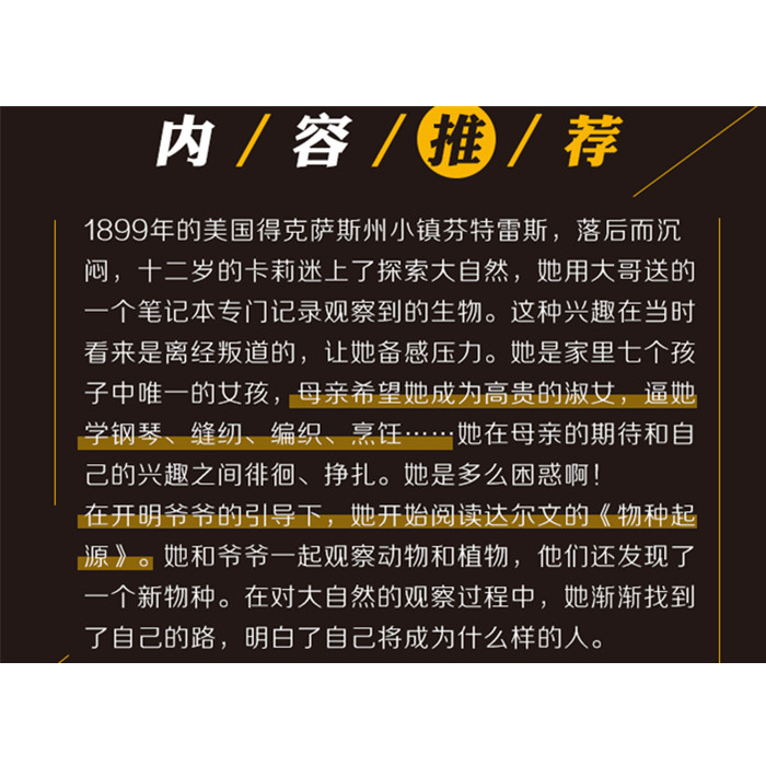 1899年的美国得克萨斯州小镇芬特雷斯,落后而沉闷,十二岁的卡莉迷上了探索大自然,她用大哥送的一个笔记本专门记录观察到的生物。这种兴趣在当时看来是离经叛道的,让她备感压力。她是家里七个孩子中*的女孩,母亲希望她成为高贵的淑女,逼她学钢琴、缝纫、编织、烹饪……她在母亲的期待和自己的兴趣之间徘徊、挣扎。她是多么困惑啊!
