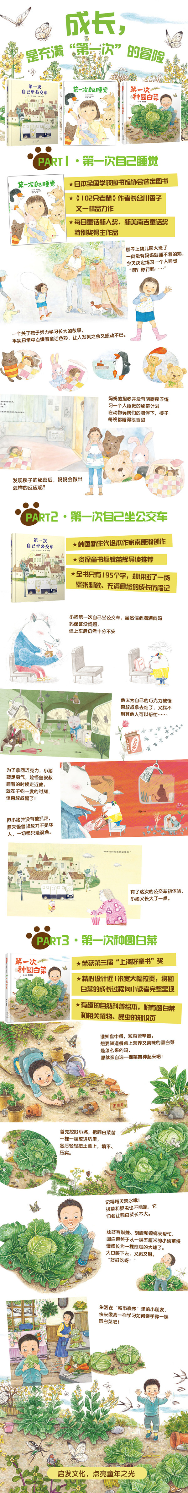 第一本认识圆白菜的自然生态绘本,第一人称叙述,让小读者跟着主人公一起“种”圆白菜,观察生态、学习知识、享受故事。作者历时一年完成这本绘本,为了呈现丰富的层次,她选用国画专用的京和纸来画这本书,先以小笔勾勒轮廓,再一层层堆叠上色。同时,在书里还设计了大拉页,将圆白菜的成长过程完整呈现;在故事最后附上圆白菜和相关植物、昆虫的知识页,可以更进一步了解与认识和圆白菜相关的生态环境。