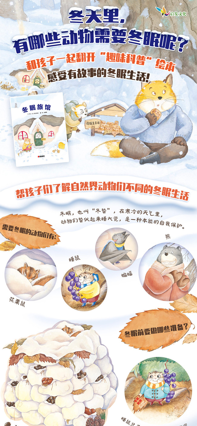 建议分类:儿童文学-图画故事这是我社出版的启发精选世界优秀畅销绘本系列,适合3岁以上的儿童阅读。冬天到了,许多动物都要冬眠。不需要冬眠的田鼠太太由于害怕寂寞,就把自己的家改装成冬眠旅馆,迎接需要冬眠的各种动物们。很快,花栗鼠、睡鼠、蝙蝠等动物们都来住店冬眠了。有一天,一只凶狠狡猾的狐狸造访了冬眠旅馆,要田鼠太太交出所有住店的客人,不然就把她吃掉。田鼠太太平安度过危机了么?冬眠旅馆又会迎来什么样的客人呢?