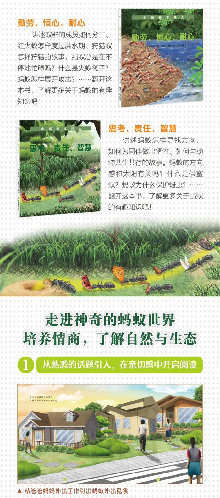 从熟悉的话题引入,在亲切感中开启阅读 生动有趣的故事,带孩子走进蚂蚁的世界 放大镜一样观察,了解蚂蚁们的点滴生活 细致、生动的画面,领略优美的自然风光 学习蚂蚁的精神与品格,培养优秀的情商 细致讲解,揭秘藏在蚂蚁身上的科学原理 走进神奇的大自然,开启生物科学的大门