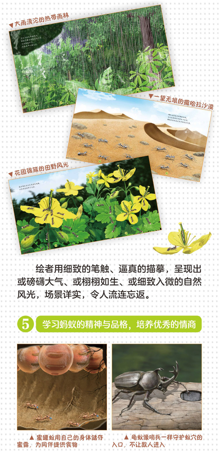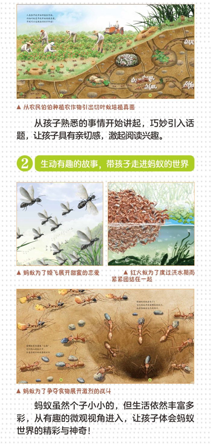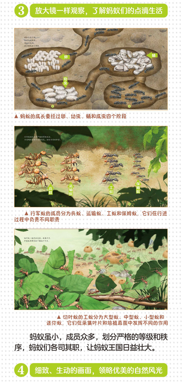 从熟悉的话题引入,在亲切感中开启阅读 生动有趣的故事,带孩子走进蚂蚁的世界 放大镜一样观察,了解蚂蚁们的点滴生活 细致、生动的画面,领略优美的自然风光 学习蚂蚁的精神与品格,培养优秀的情商 细致讲解,揭秘藏在蚂蚁身上的科学原理 走进神奇的大自然,开启生物科学的大门