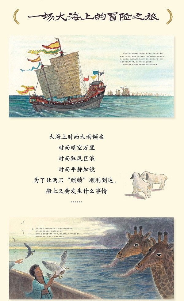 本书以“郑和下西洋”抵达非洲、带回长颈鹿的故事为背景,以“用世界语言讲好中国故事”为创作初衷,以儿童视角为依托,生动再现了值得永世铭记的历史壮举。 本书讲述了一个富有传奇色彩的故事:郑和船队到达非洲后,广交友谊、多行善举,并与当地的小男孩莫萨结缘。船队返程时收到的礼物中有一种叫作“基林”的动物,由于发音相似,被船队误以为是传说中的麒麟。小男孩莫萨舍不得他的动物朋友,悄悄躲进船舱里,和麒麟一起开启了朝向神秘东方的远航…… 本书由日本著名绘本大师小林丰手绘,作者以真实的历史资料为创作素材,用考究的笔触和生动的细节刻画了“郑和下西洋”的动人场面。作品视角独特、极具创意,把丰富的中华历史文化内涵以富有想象力的文学、艺术形式表达出来。同时,该书视野宏阔,在当下探索全球化国际形势及世界未来发展走向的大语境下,具有非常重要的中国意义。