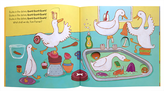这位老奶奶画的太可爱了,笑眯眯的眼睛和红彤彤的脸蛋,谁能想到她竟然吞下了一只苍蝇后,紧接着又吞下了其他的动物。小朋友们,你们能想到老奶奶的结局吗?这本书的设计手法充满童趣,在书的背面隐藏着许多小心机哦,书中的图片暗示了下一个动物的出现。同时背面的每一页都采用了不同的颜色并用孩子般稚嫩的笔迹写出了重复的语句,而洞洞的设计又让这些文字形成了叠加的效果,另有一番情趣。在书的正面,老奶奶每吞下一只动物,洞洞中就出现一只动物,她肚子也变的越来越大。故事情节简单又夸张,充满了西方人特有的幽默和大胆想象,很符合孩子的阅读心理。……