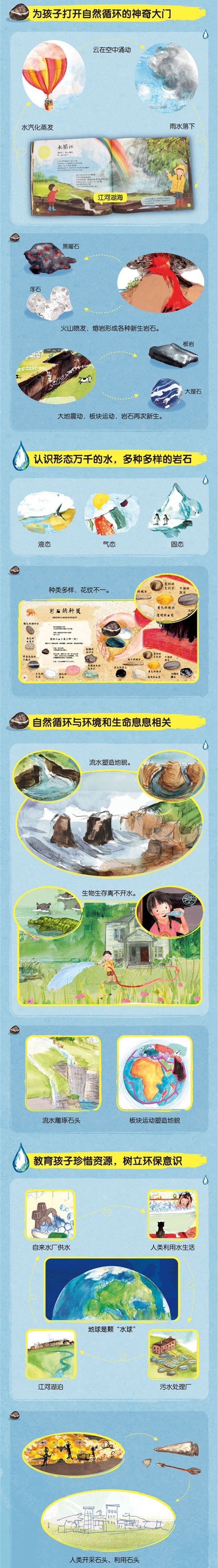 小水滴,揭秘大循环。通过一滴水的旅程,向孩子们呈现出从雨到海又到雨的生生不息的水循环的图景,揭开了水对动植物、人类、地理等的深刻影响,让孩子对水循环形成系统性认知。