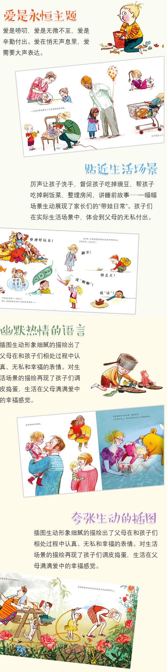奥吉尔维将生动的铅笔线条和柔和的墨水结合,用粗略的线条和明亮的色块完美地诠释了孩子们的生活。松散的鞋带,任性摆放的玩具,溢出的食物成为图画大背景,让爸爸妈妈们恨不得能冲进画里收拾好一切。而孩子、父母、路人等表情细节刻画,和文字完美结合,幽默地讲述了父母的爱。