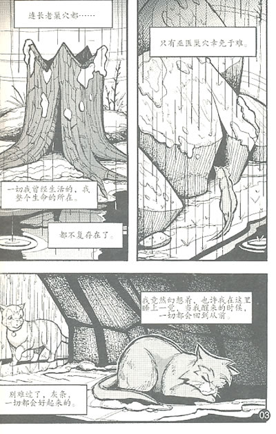 灰条和米莉最终找到了雷族的旧家园,但是,两脚兽们已经摧毁了森林,灰条害怕他的同伴已经被杀死或被俘虏了,而米莉坚持他们必须继续寻找族猫。接着,一个老朋友给他们指点了族猫们很多夜晚前走过的路,、但是危险仍然潜伏在他们四周,灰条担心:他和米莉会迷失在一个不可能完成的冒险中……