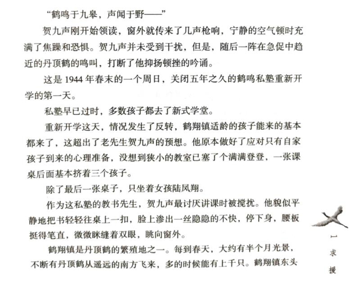 这是一部为建党百年献礼的长篇小说。故事采用人和动物双线结构,以几个中国孩子和日本孩子还有两群丹顶鹤为主线,内容涉及日本侵华时的奴化教育,主题是地下党在抗日中的中流砥柱作用,以及被占领区普通百姓面对侵略者的淫威不屈不挠展开抗战。故事以翅膀受伤的丹顶鹤最后重新飞上蓝天为隐喻,说明任何磨难都打不垮中华民族。故事同时通过中国人对侵略者孩子的救助与观照,被占领区社会各界对日本奴化教育的反抗,表现了中华民族的智慧勇敢和博大胸怀。